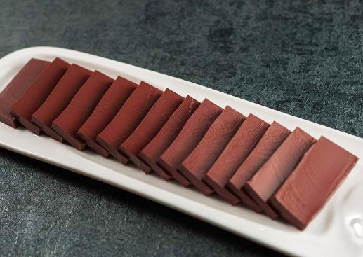 4、優質鴨血捏成條狀,捏后手上紅色素少;劣質鴨血捏著顆粒狀且粘手,捏后整個手指變紅。殘留在手上的血顏色不深,說明色素沒有亂加。如果有顆粒感,可能是混入了其他東西。
