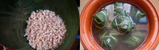 粽葉洗干凈,放在開水中焯一下立刻撈出,然后泡在冷水中待用。