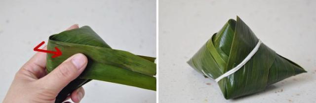 3、然后把兩邊多出來的粽葉依次翻折下來,包好。不要留有縫隙,謹防餡料露出。
