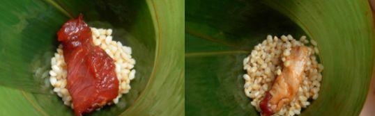 5.放糯米將肉全部蓋住,但是粽葉留出1厘米高的邊以便“包扎”