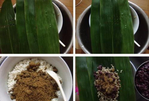 3.在中間的葉子上放入拌好的糯米,放入蜜豆在撒上紅糖。