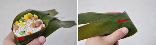 4.左手用力拿住,右手把上面的粽葉往下折,蓋住米。然后將粽子包扎緊實。