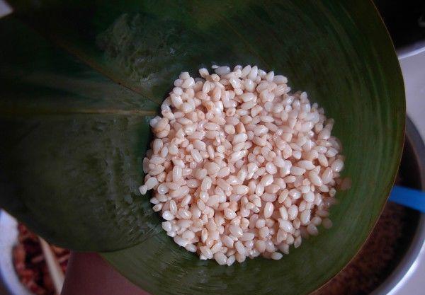 3.將葦葉按照折痕窩成漏斗狀,里面裝滿餡料,蜜棗放在中間,這樣煮好的粽子才甜味均勻。